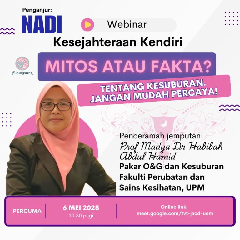 💬 “Mitos & Fakta Tentang Kesuburan: Jangan Mudah Percaya!” 🗓️ Tarikh: Selasa, 6 Mei 2025🕥 Masa: 10:30 pagi🎙️ Speaker Jemputan:Prof Madya Dr Habibah Abdul HamidPakar Perunding O&G dan Pakar Kesuburan, Fakulti Perubatan dan Sains Kesihatan UPM 📍 Google Meet: https://meet.google.com/tvt-jacd-uem […]