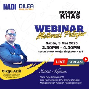 Sukacita dimaklumkan di bawah Elemen Program Khas NADI-Nurture DILEA, Webinar Motivasi Pelajar Edisi Kedua akan diadakan dan terbuka kepada pelajar Tingkatan 4 dan 5.
